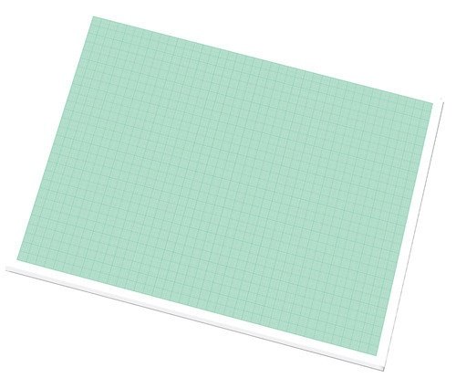zeleně předtištěný milimetrový papír je rozdělený po 1, 5 a 10 milimetrech a najdete ho jen na jedné straně listu, druhá strana je čistá, z bezdřevého papíru s plošnou hmotností 80g
